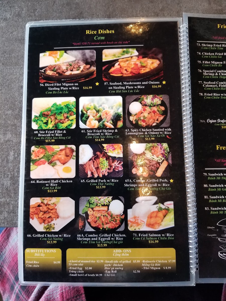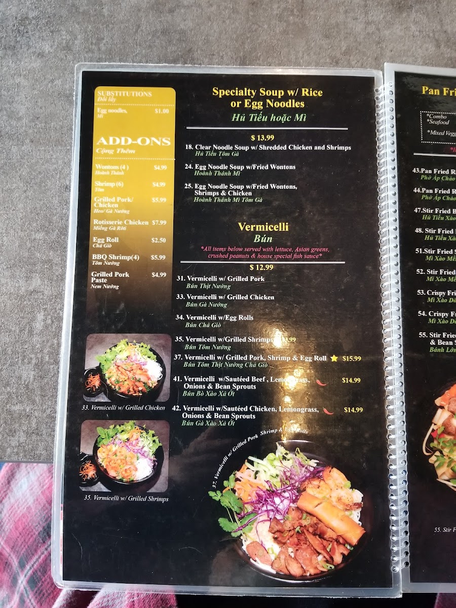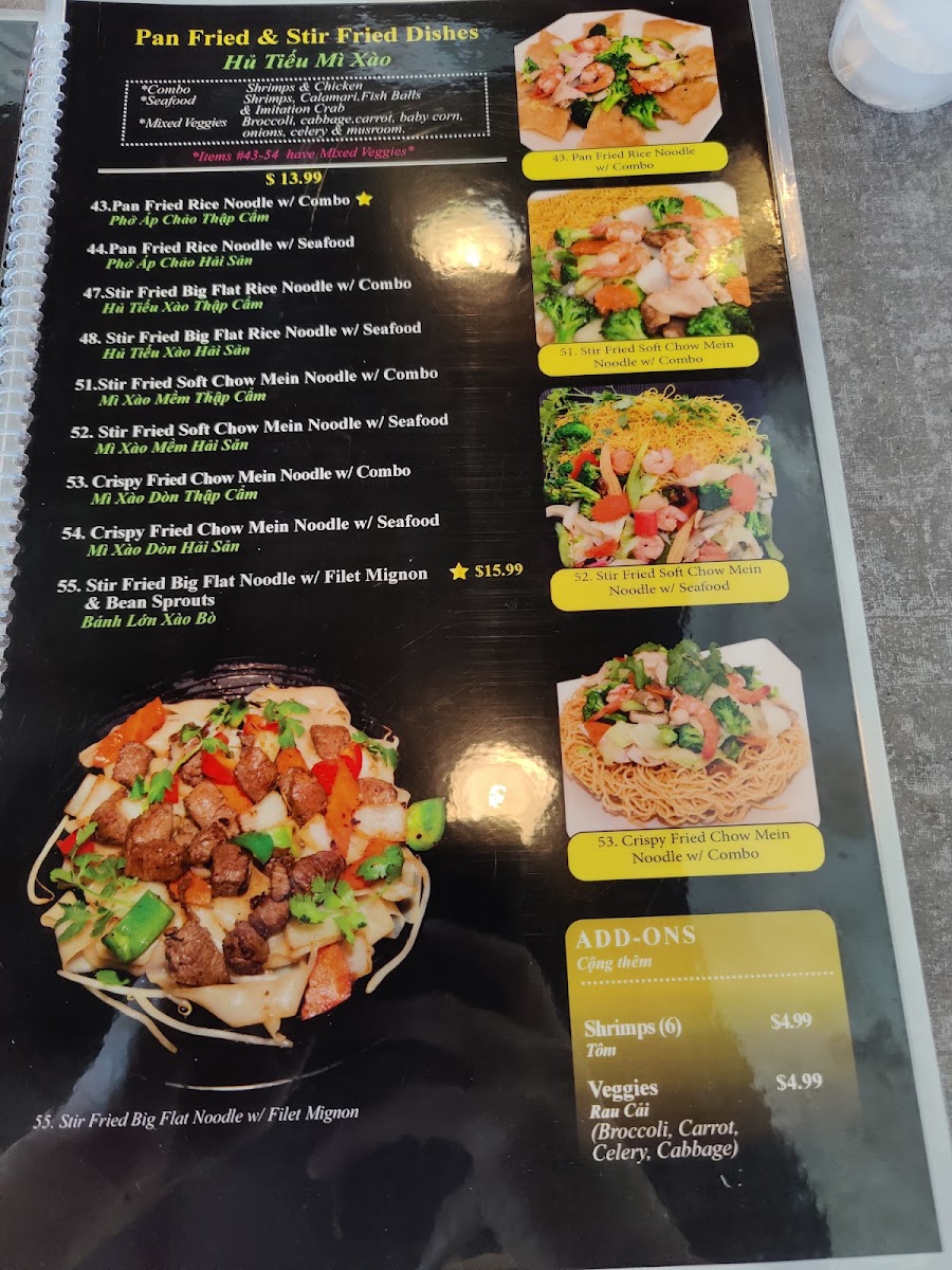 At Pho Anh, the menu is a treasure trove of options, catering to lovers of both vegetarian delights and hearty meat dishes. The Vegetarian Fried Rice (Cơm Chiên Chay) is a colorful medley of egg, broccoli, mushrooms, and baby corn, bursting with flavor at just $18.99. For a more traditional experience, try a bowl of their renowned Rare Steak Pho (Phở Tái Favorite), where tender slices of steak swim in a fragrant broth that promises to comfort your soul for only $17.99. Seafood enthusiasts will adore the Seafood Combination Pho, featuring fresh shrimp and calamari—a wonderful choice for those who crave a coastal twist to classic pho.